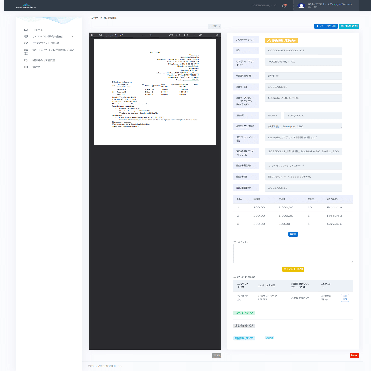 このような課題を解決するために、弊社が提供する**「Connected Base」**を活用すれば、言語を知らなくても書類をアップロードするだけで日本語ベースで情報整理が可能になります。