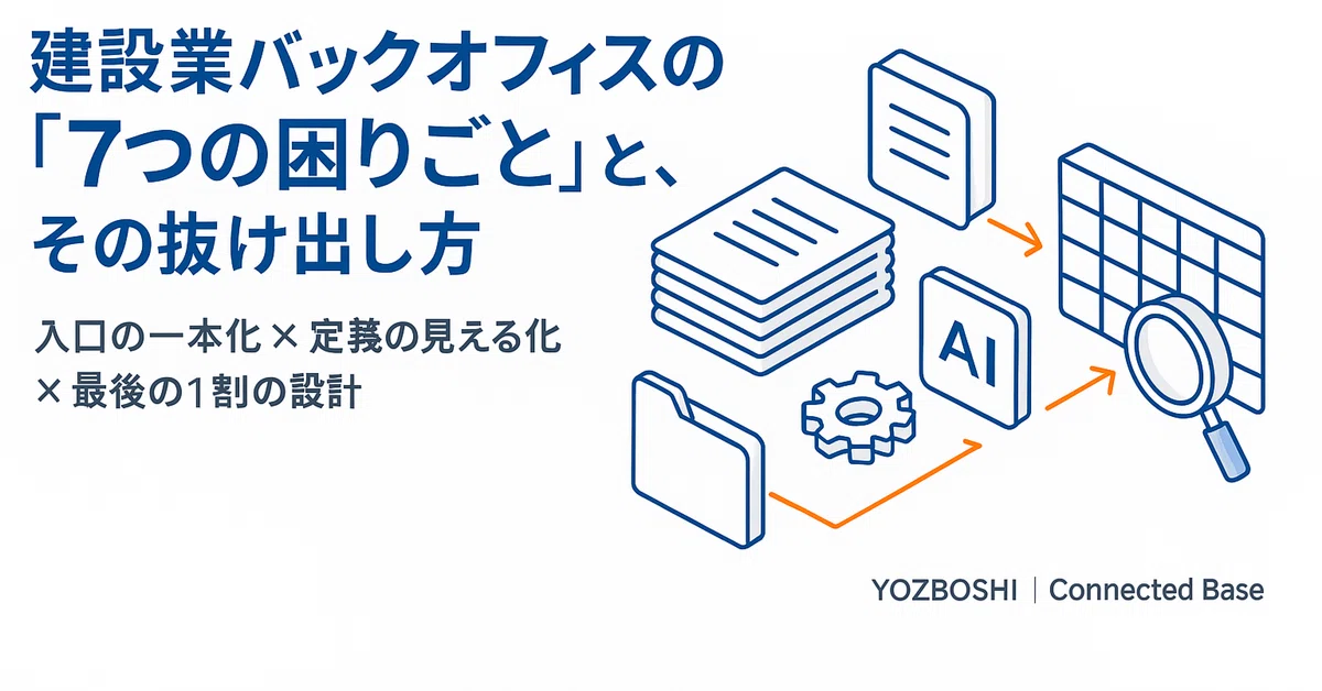 見積・契約・発注・検収・請求・支払…。現場は紙とPDFとExcelに挟まれ、二重入力や突合ミスが日常化。AI-OCRやLLMを入れても“最後の1割(例外と属人判断)”が残り、結局Excel地獄から抜け出せない——そんな声をよく聞きます。本稿では、建設業バックオフィスの代表的な7つの困りごとを症状→原因→抜け出し方→最初の一歩→見るべき指標の順で解説します。