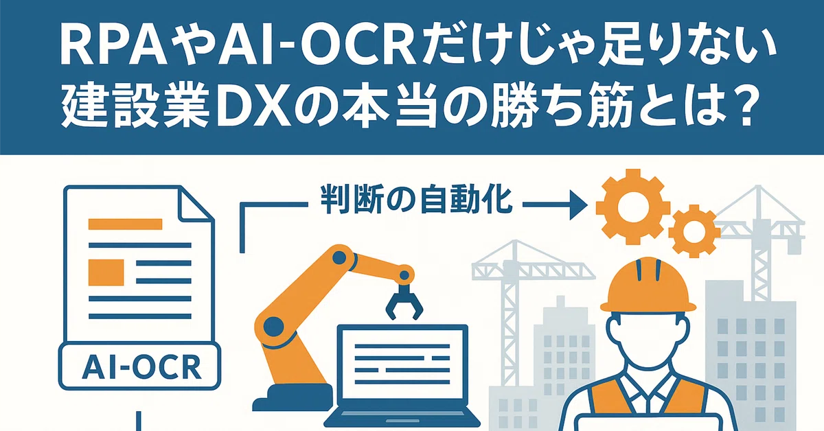 人の判断とAI 働き方・バックオフィス改革 建設DX 藤井翔吾 AI-OCR, RPA, ナレッジ継承, 建設業, 現場DX 0 コメント RPAやAI-OCRだけじゃ足りない! 建設業DXの本当の勝ち筋とは? 建設現場は、見積・積算・契約・…